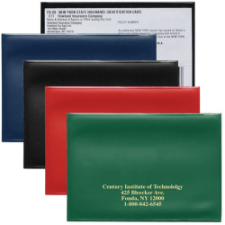 This personalized long insurance card holder is available in two sizes for you to choose from so that you can select the one that fits your clients needs best. 4 h x 7 75 w available in blue black or red opening on side. Custom auto registration holders and promotional proof of insurance wallets are printed with your logo or silkscreened. Our registration id card holders are available in a wide range of styles and sizes to meet all of your agency s needs.